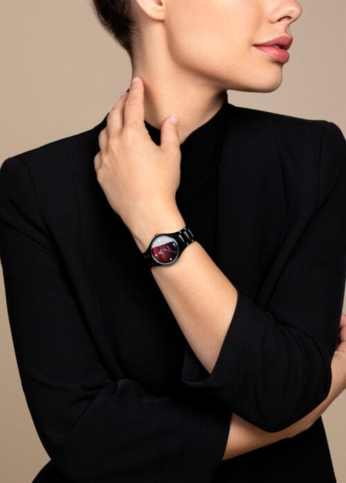 I got my red watch on tonight – confident women consider the Rado True with cherry-red dial and four sparkling diamonds to be a watch that lends any evening dress a touch of glamour. The round case flows smoothly into the bracelet and, with the velvety brilliance of the black high-tech ceramic, completes the elegant appearance of the 30-mm diameter watch.