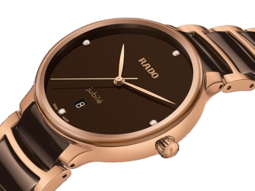 The classic Centrix Quartz Diamonds watch has been reworked not only technically, but also aesthetically. The modified model has a rounded sapphire crystal that extends all the way to the edge, as well as a curved case blending with the curved crystal edge. The overall appearance of this iconic timepiece is completed with adjusted case lugs and a bracelet made of polished rose gold-coloured PVD-coated stainless steel with brown high-tech ceramic middle links. The brown lacquered dial with 4 diamonds, emphasised with the printed “jubilé” logo, matches perfectly with the rose gold-coloured hands. Thanks to the PreciDrive and HeavyDrive features in the calibre R073 quartz movement, the watch has greater accuracy and resistance to shocks. The watch is water-resistant down to 50 m.