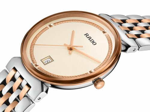 The harmonious design of the Rado Florence calls to mind the elegant domes and towers of the city from which the collection takes its name. Powered by a reliable three-hand Quartz Rado calibre R073 movement, this watch ensures greater accuracy and resistance to shocks. The 38 mm watch has an edge-to-edge-bevelled, curved sapphire crystal. The watch boasts a polished stainless steel case, crown, bezel and case back. The bracelet made of polished stainless steel with rose gold coloured alternate middle links completes the overall appearance of this classic timepiece. The champagne dial with rose gold glitter decoration, emphasised with the grey printed “Rado” logo, matches perfectly with the rose gold coloured hands. The watch is water resistant down to 50 m and is also available in S size, which makes it an ideal couples’ watch.