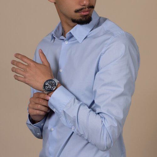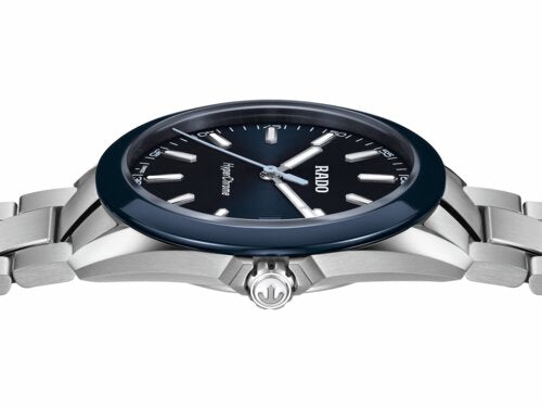The case, sculpted from polished and brushed stainless steel, is encircled by a polished blue high tech ceramic bezel—an elemental combination of strength and refinement. Topping this resilient construction is a curved sapphire crystal with anti-reflective coating on the inner side, offering exceptional scratch resistance and crystal-clear legibility. With water resistance to 15 bar (150 metres), every element of the architecture is designed for lasting precision, durability, and confidence in any setting.